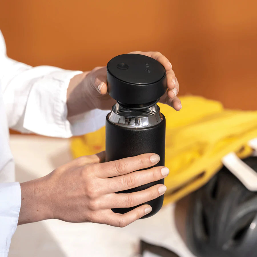 Slide into action. Our award-winning Carter Move Mug just got even more convenient. The uniquely angled lid slides open with the flick of a thumb for mid-commute coffee breaks, then effortlessly slides back securing your drink and locking in heat and flavor.